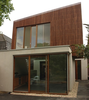 Voor de buitenzijde voor thermisch gemodificeerd hout gekozen. De latten zijn nauwkeurig uitgetekend en d.m.v. een nieuw onderzochte bevestigingswijze gemonteerd op de achterconstructie. De bevestigingsmiddelen zijn niet zichtbaar . Hierdoor ontstaat een licht en demontabel systeem van houten latten aan het exterieur,die in de toekomst eenvoudig als elementen zijn te vervangen. De bovenbouw van de nieuwbouw is hierbij als houtskeletbouw opgezet om de perspectief te versterken door de schuine vlakken en lijnen die versneld naar elkaar toelopen.
