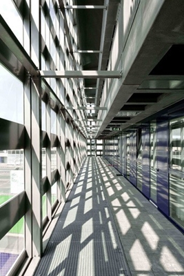 De mix van private en publieke functies vergroot de complexiteit verder: winkels die naar het winkeldek zijn georiënteerd, private balkons die naar de zon zijn gericht, een geluidsbarrière langs de ringweg, een open galerij aan het belangrijkste stadsplein, bewegwijzering en advertentieruimte voor winkels.