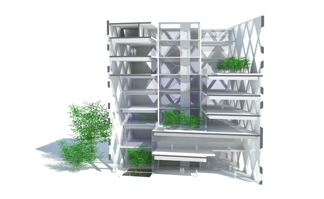 Het ontwerp is benaderd vanuit een integraal en pragmatisch standpunt, waarbij de plaatselijke cultuur en klimaat, het opgegeven programma en de specifieke locatie voor het gebouw de inspiratie is geweest. Het opgegeven programma geeft een duidelijke trapsgewijze stapeling aan en heeft aanleiding gegeven om het programma juist tegen de gevel aan te leggen, waardoor in het gebouw aaneengesloten ruimtelijke patio's ontstaan. Deze patio's verwijzen naar de mooie tuinen waar Teheran zo beroemd om is. Alle omliggende vertrekken zijn gericht op deze patio's en kunnen daarmee de sfeer en het indirect daglicht binnenhalen. De commerciële ruimten op de begane grond zijn maximaal gericht op de winkelstraat doordat ze naast elkaar liggen, met de etalageruimten aan de straat. De kantoren liggen in plattegrond gezien in twee richtingen in een U-vorm om de patio's heen. De appartementen liggen op de bovenste verdieping. Al deze ruimten zijn omarmd door een expressieve gevel opgebouwd uit grote ruitvormige ramen en openingen, geïnspireerd op de karakteristieke ruitvormige ornamenten in de locale Iranese monumentale architectuur. Samen met het typisch Iranese zandgekleurde stucwerk en de sterk spiegelende ramen is het gebouw duidelijk herkenbaar. Het gebouw heeft hiermee een duidelijke eigen en herkenbare identiteit en verbind hiermee de klassieke Iranese architectuur en cultuur met de hedendaagse moderne architectuur.