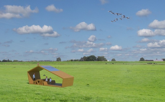 Het uitgangspunt voor de vorm van het bouwsel is de doorsnede van de vorm van een traditioneel huis. Het doel hierbij is een ruimtelijk object te creëren in het open landschap dat speelt met open en dicht. Het 'dichte' is de muur van het huis en vormt een kader voor het 'opene'. De vorm is opgetrokken vanuit een plat vlak dat op verschillende plaatsen is omgevouwen en gaat over in een tafel met twee banken met daarboven een hangende lamp. Hiermee verwijst de vorm van het huis naar de eetkamer van thuis. Het huis kan worden gebruikt als rust-, schuil- of picknickplaats en geeft iedereen het gevoel dat het zich het huis kan toe-eigenen als zijn of haar 'tijdelijk veilig thuis'. Fietsende passanten kunnen hier schuilen voor de regen en hun fiets droog stallen doordat er extra ruimte is gecreëerd in het huis. Hierdoor is de vorm van het huis asymmetrisch. Vanuit deze plek kan iedereen genieten van het fantastische uitzicht op het Lingewaardse landschap. Ook 's avonds kan het huis worden gebruikt omdat de zonnepanelen overdag energie opwekken om de lamp boven de tafel te laten branden.