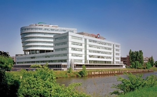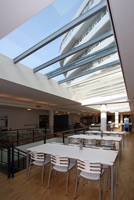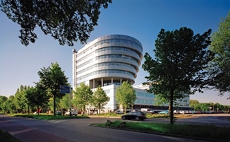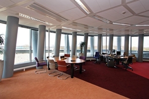 De opgaande delen worden bekroond door installatieruimten. In de “oksel” van het hoogste deel zijn verbijzonderde ruimten voorzien (twee lagen hoog), om de andere verdieping, waar “rust-” c.q. “overleg-” hoeken gecreëerd kunnen worden. De zich naar boven toe verbredende en daardoor markante hoogbouw wordt door een insnoering op de 2e verdieping in z’n zwevende karakter ondersteund. Ook hier is aanleiding in het gebruik, het zo ontstane transparante gebied, te verbijzonderen.