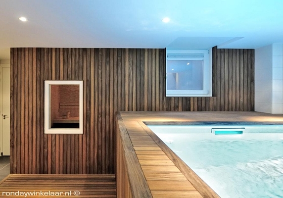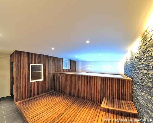 In de kale kelderruimte van de villa is deze spa/wellness gecreëerd en voorzien van alle gemakken, waaronder een zwembad met tegenstroom. Ook is er een ruime sauna, inloop douche en toilet geplaatst. Om rust en ontspanning in het ontwerp te krijgen is er gekozen voor zowel natuurlijke als strakke materialen. De buitenzijde van het zwembad en de sauna is bekleed met een houtsoort afromosia dat een warme uitstraling heeft en bestand is tegen vochtige omstandigheden. De langste wand in de ruimte is voorzien van steenstrips van zwart leisteen. Door indirect licht in een koof boven het leisteen toe te passen ontstaat er een mooie schaduwwerking. Als vloer van de douche zijn er kiezels gebruikt. Naast het buitengevoel geven deze stenen een heerlijke voetmassage tijdens het douchen.