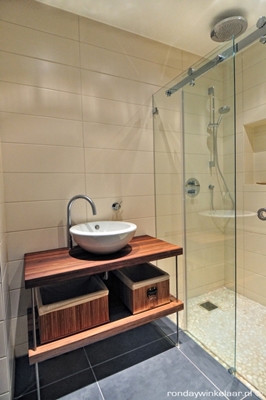 Tegenover alle natuurlijke materialen is er gekozen voor wit stucwerk op het plafond en grote witte tegels van 1m breed op de overig wanden. Door deze contrasterende samenstelling is er een ruimte ontstaan die zowel zeer modern als warm aanvoelt. Een perfecte combinatie om te ontspannen in het hectische bestaan van tegenwoordig.