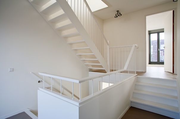 De ‘split-level vloer zorgt voor een ruimtelijk trappenhuis, waarbij het daglicht tot in het midden van de woning kan binnenvallen.