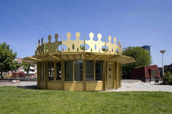 Door de bergruimte los te koppelen van de verblijfsruimte, was het mogelijk het Haagse Hopje uit te voeren als een alzijdig transparant paviljoentje. De ronde vorm en de goudkleur zijn geïnspireerd op een kroon, refererend naar de Hofstad. De kroonlijst wordt gevormd door een abstract silhouet van kinderen die elkaars hand vasthouden en samen een kring vormen. Rond de glazen puien zijn geperforeerde aluminium panelen geplaatst. Als de panelen opgeklapt zijn vormen deze luifels, waardoor zichtbaar is dat het Hopje open is. 's Nachts schijnt er door de perforaties licht naar buiten. Hierdoor is het nieuwe Haagse Hopje zowel overdag als 's nachts een baken in de buurt.