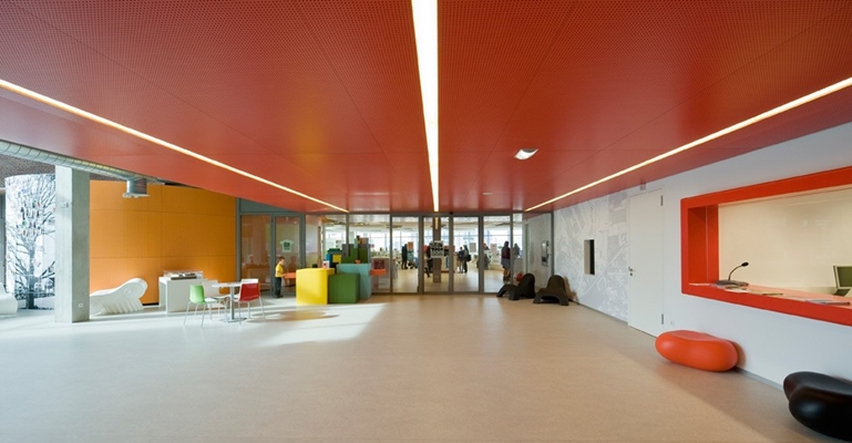 Binnen het concept van het ICOON is tussen deze volumes een daklandschap toegevoegd. Dit daklandschap wordt gebruikt als buitenruimte voor de school.