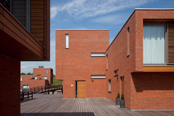 Beeldbepalend is de samenhangende plastiek van de 16 woningen, grotendeels uitgevoerd in rondomgaand rood metselwerk. De gevels zijn sober gematerialiseerd waardoor de nadruk komt te liggen op een gemeenschappelijke vormentaal van kubistische draaingen van vlakken, hoeken en randen. Her en der hebben de vensterkaders extra nadruk gekregen. De omrandingen van de patio zijn integraal onderdeel gemaakt van het gevelbeeld en er zijn grotere glasvlakken gecreeerd door puivullingen op de (dubbele) verdiepingen. De trappen, borstweringen en grondkeringen ter plaatse van de collectieve dekken bouwdelen zijn gelijk aan de woningen gematerialiseerd en smeden het plan tot een geheel. Zo profiteren de indiviuele woningen (en hun bewoners) allen van de kwaliteit van het collectieve beeld.