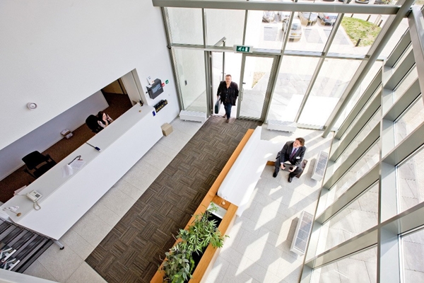 In dit nieuwe hoofdkantoor worden vijf bestaande vestigingen ondergebracht. Een nieuw pand met voor de werknemers veel onbekenden collega’s dus. Uitgangspunt bij het interieurontwerp was een lichte en transparante werkomgeving te creëren met de twee lichthoven als natuurlijk rustpunt. De basis van het interieur bestaat uit glazen wanden en een banenpatroon van tapijttegel op de vloer. De glazen wanden zorgen enerzijds voor een grote openheid (interactie) tussen de werknemers, anderzijds zorgt het lijnenspel op de vloer voor een sterke visuele verbinding van de ruimten onderling, waardoor de werknemers visueel in een grote ruimte zitten.