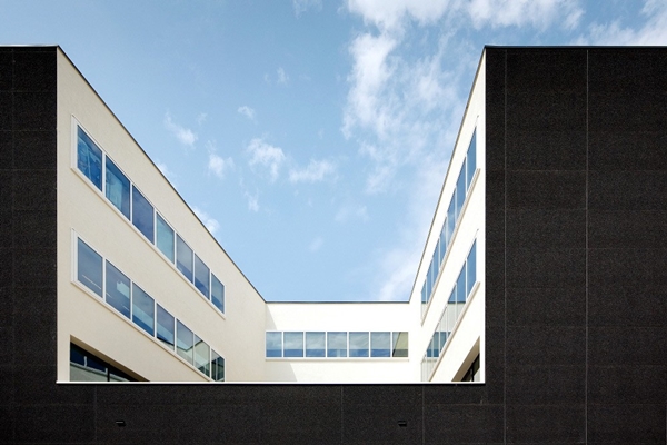 Dit effect wordt versterkt door de binnengevels van de lichthoven in het wit uit te voeren en rest van de gevels in zwart waardoor een maximaal contrast bereikt wordt. Naast deze grafische kwaliteit geven deze kleuren het gebouw het chique effect van een smoking terwijl het relatief goedkope gevelmaterialen zijn.