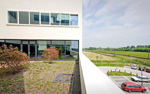 Om te verkomen dat de receptie op de begane grond geen contact heeft met de boven het bedrijf gesitueerde kantoren is de receptie opgetild en voorzien van een buitentrap. Analoog aan het witte ‘lichthoven-thema’ is bij de entree ook een “witte hap” uit het bouwvolume gehaald, wat de totale compositie versterkt!