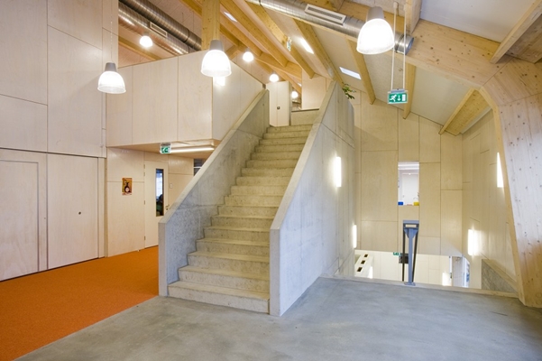 Het probleem PrO Assen, school voor praktijkonderwijs met het motto ‘leren door doen’, was toe aan een nieuw pand. De school voldeed niet meer aan de fysieke eisen en de faciliteiten die gebruikt werden bij praktijk vaardigheden waren ook hard aan vernieuwing toe. Het pand heeft als basis een ‘betonlandschap’ met daaroverheen een sculptuur van hout. Van de binnenwanden is een kwart van beton. De overige 500m2 vormen het ‘houten landschap’, voorzien van zware underlaymentplaten met een whitewashlaag. Metalstud-wanden op een stalen geraamte zouden hiervoor de basis vormen. Maar dit bleek niet haalbaar, vanwege het geringe aantal bevestigingspunten op de gipsplaten en de zwaarte van de afwerkplaten. De oplossing De hoge schroefvastheid van de 40 cm brede IW148 panelen bood uitkomst. Hierdoor konden de Radiplex-platen op élke gewenste plek worden bevestigd. Daarnaast konden schoolborden en sanitaire accessoires zonder gebruik van achterhout worden opgehangen. Dat scheelt materiaal én manuren. Ook andere aspecten van de FAAY producten, zoals de hoge brandwerendheid en goede geluidsisolerende eigenschappen waren voor dit project zeer waardevolle redenen om de keus te maken.