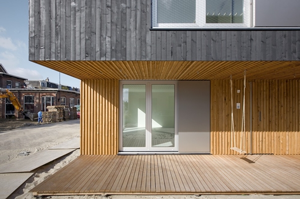 De begane grond daarentegen is een polyvalente ruimte, waar alle bewoners de mogelijkheid hebben te spelen, werken, lezen of aan andere gezamenlijke activiteiten deel te nemen. op deze wijze worden er activiteiten getoond die zich normaal gesproken afspelen op de zolders van Nederlandse huizen. Grote ramen zorgen voor een vloeiende overgang van binnen naar buiten, waardoor de entree veranda, welke de traditionele voortuin vervangt, zowel het communicatieve hart van het gebouw, als een informeel ontmoetingspunt met de buurt vormt. De doorlopende materialisatie van vloer, muur en plafond creëert een subtiele overgang van publiek naar privé.