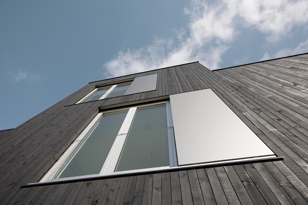 De middelste verdieping maakt gebruik van de maximale afmeting van het kavel en herbergt de ouder- en kinderslaapkamers. Door de uitkraging van deze verdieping, wordt de entreesituatie mogelijk gemaakt. De zwart gekleurde houten gevel refereert direct aan de historische zwarte houten huizen in de regio. Om de kosten te minimaliseren, werd de detaillering gereduceerd tot een absoluut minimum en werd er slechts één formaat venster gebruikt. Rolluiken aan de buitenzijde zorgen voor privacy en voorkomen oververhitting in de zomer. Het gebouw voldoet tevens aan alle lage-energienormen.