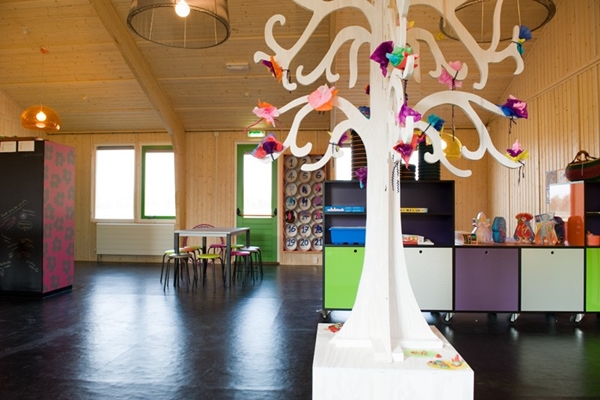 “Ook de boom in de ruimte is een eigen ontwerp en is ontstaan door het naar binnen halen van de natuur. Binnen is Buiten, Buiten is Binnen. De boom moet de kinderen, maar ook de pedagogisch medewerkers aanzetten tot creativiteit. Een wisselende expositie van kunstwerken in de boom is het uitgangspunt. Verder is het zitten op vijf manieren tot uitvoering gebracht. Het loungen, het hoog en laag zitten op een kruk(je), maar ook het zitten op het podium en het liggen op de grond om te kunnen kleuren op het krijtbord op de kast.”