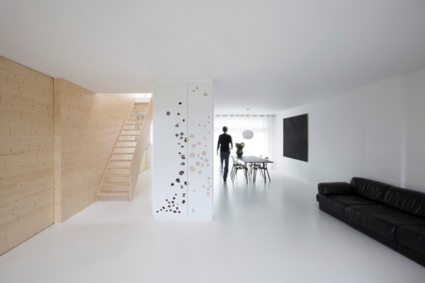 Centraal in het huis is een groot atrium en trappenhuis gemaakt met daarboven een elektrisch schuifdak van glas dat de toegang tot het dakterras is. Dit brengt natuurlijk licht tot in de woonkamer. Constructies en leidingen zijn weggewerkt in een ruimtescheidend meubel, waarin ook de keuken is opgenomen.