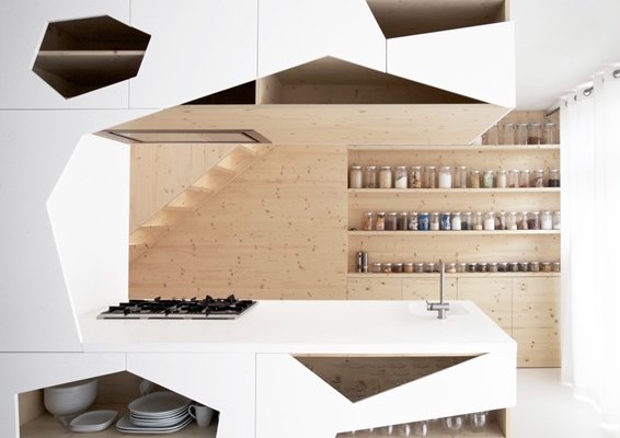 De witte lasergesneden fronten lopen van vloer tot plafond. Het patroon voorziet in een dynamische afwisseling van open en gesloten kasten, en functioneert als geintegreerde handgreep. De transparante 'huid' van het object geeft diepte aan het volume. Het overige meubilair gaat daarin mee met name de 'chair one’ stoelen van Grcic.