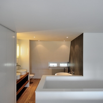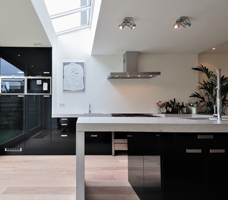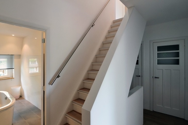 De woning heeft aan de achterzijde een uitbouw gekregen met een schuifpui. Het dak van de uitbouw bevat een daklicht die samenspeelt met de keuken en het eetgedeelte. In de voorkamer is een besloten tv-hoek gecreëerd, die wordt afgeschermde door de dwarstrap, terwijl de doorlopende boekenkast deze ruimte juist verbind met de woonkamer. De trap is voorzien van stucwerk en wordt daardoor meer benadrukt. Het trappenhuis is voorzien van een gesloten wit gestucte balustrade die tot aan de zolderverdieping doorloopt. Op de eerste verdieping zijn drie slaapkamers en een ruime badkamer. Aan de voorzijde van de zolderverdieping is een studeerkamer gekomen, de overige ruimte op zolder is de master bedroom met een en-suite badkamer. De zolder is bewust zo open mogelijk gelaten zodat er een herkenbare 'loftsfeer' ontstaat.