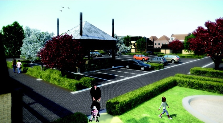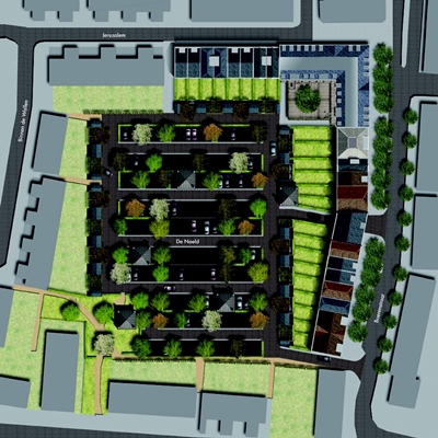 Het ontwikkelen van woningen en een parkeerterrein voor 150 parkeerplaatsen met een groene omlijsting, is gekozen als ruimtelijke drager van het plan.