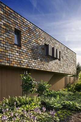 voorgevel met veelkleurige natuurleien, red ceder en koper