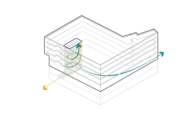 De drie verbindende routes (door de gebouwen, colonnade en logistiek)