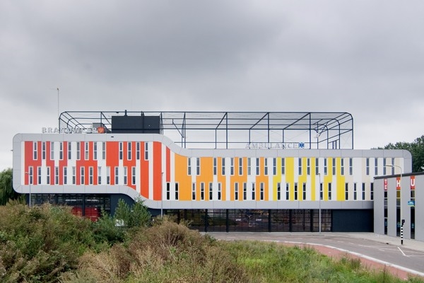 In de ontwerpfase is gewerkt aan de gevraagde functionaliteit en duurzaamheid. Zowel de hoofddraagconstructie als de gevel zijn in staal uitgevoerd. De gekleurde gevelvlakken lopen van brandweerrood naar ambulancegeel en zijn voorzien van een zilverglimmende band. De patrijspoorten in het slaap- en woongedeelte geven uitzicht op het werkterrein van de brandweer.