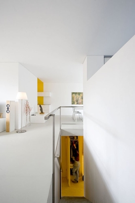 Een extra accent krijgt de woning door middel van helder kleurgebruik. Op specifieke plekken worden de overgangen tussen binnen en buiten verbijzonderd door middel van een warme, zonnige geeltoon.