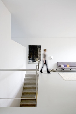 Ook in ruimtelijk opzicht zijn beide verdiepingen sterk verschillend. Beide lagen hebben hun eigen ruimtelijke karakteristieken. Zo wordt de 1e verdieping gekenmerkt door een open relatie tussen de ruimtes onderling, alle ruimtes zijn onderling zonder tussenkomst van gangen met elkaar verbonden. Binnenwanden zijn zodanig geplaatst dat er een overhoekse zichtlijn ontstaat tussen de eetruimte en de woonruimte. Hierdoor wordt er extra dieptewerking gecreëerd. Daarnaast zijn de binnenwanden vrijgehouden van de buitenwanden waardoor het mogelijk is om in een continue lijn langs alle buitenmuren te bewegen. Waar de verdieping gekenmerkt wordt door een grote ruimtelijke dynamiek is de begane grond juist veel statischer in opzet. Hier zijn het de afgesloten, afzonderlijke kamers die de ruimte definiëren.