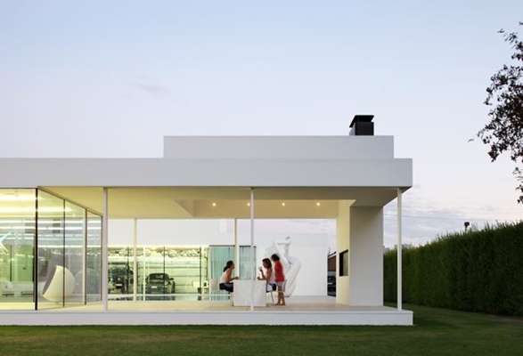De binnenzijde van deze U-vorm is volledig beglaasd zodat de ruime circulatie naar de slaapkamers en de eetplaats / leefruimte rond de binnenkoer helemaal deel worden van dit “hart” van de woning, de sociale kern van het huis. Hier hoort ook de autostaanplaats bij, die (als de wagens buiten slapen) dubbel dienst doet als feest- en ontvangstruimte.