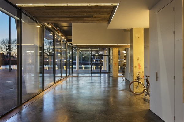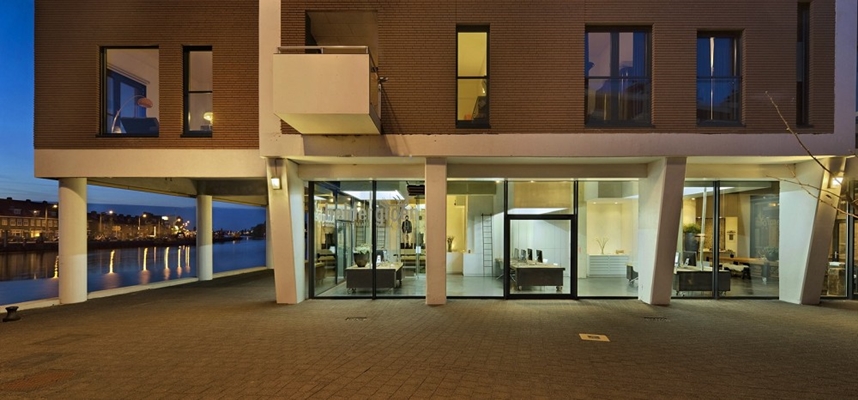 De open ruimte is aan drie zijden omsloten met glas. De transparantie gevel biedt exposure en een fantastisch uitzicht over het water en de historische binnenstad. De dichte zijde van het kantoor dient als facility-wall. Alle ondersteunende voorzieningen zijn in een witte sculpturale kastenwand opgenomen, die is vervaardigd van platgewalste autodeuren.