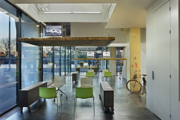 De werkplekken worden dagelijks omhoog gehesen, waardoor de ruimte na kantoortijd op verschillende manieren kan worden gebruikt: tentoonstellingen, clinics, lezingen of een goede party. De houten tafelbladen (vervaardigd uit oude telefoonpalen) hangen aan stoere lieren en rusten overdag op verrijdbare ladekastjes van verroest staal. De beweegbare onderdelen en industriële materialen verwijzen naar het oorspronkelijke gebruik van de silo en sfeer op de kade. Veel materialen zijn hergebruikt en in de directe omgeving gevonden.