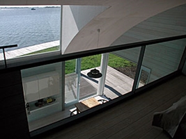 Deze cabine van hout, metaal en glas biedt beschutting en comfort voor het verblijf in de natuur. De open hoeken en het grote daklicht bieden ongehinderd zicht over het wijde meer. Rondom zijn terrassen die worden beschut tegen wisselende windstanden door het verschuiven van de grote houten luiken. Bij vertrek wordt het huisje afgesloten met de luiken die het beschermen tegen onstuimig stormweer. Aan de landskant vormt de royale luifel een overdekt entreebordes met terugblik over het polderlandschap.