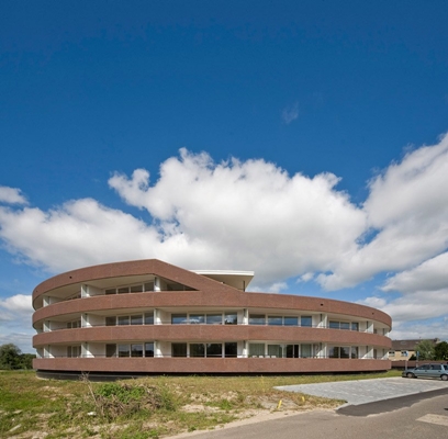 Bij de uitwerking van het gebouw is ervoor gekozen het complex geleidelijk in hoogte te laten oplopen. Aan de westzijde is er een tweelaagse bebouwing, terwijl er aan de landschapszijde een vierlaagse bebouwing is. Naast de twee centraal gelegen trappenhuizen, zorgen een aantal extra trappen voor een optimale relatie tussen de diverse verdiepingen. In westelijke richting waaieren de balkons op de begane grond uit, de gevelband ter plaatse van het dak volgt deze lijn. Aan de uiterste westzijde worden deze onder- en bovenband middels een verticale gemetselde strook met elkaar verbonden
