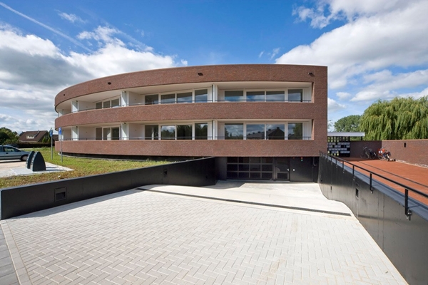 Gezocht is naar een enkelvoudige krachtige vormgeving. Het ronde blok zweeft als het ware op een ca 800 mm teruggelegen donker gekeimd basement. De rondlopende horizontale gemetselde banden bepalen sterk de architectonische compositie. Alle terugliggende scheidingswanden tussen de appartementen inclusief alle houten puien zijn wit van kleur.