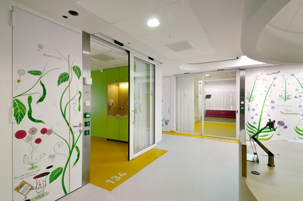 The architects OD205 are the architectural designers and OPERA Amsterdam are responsible for the interior design. OPERA defined three principle areas of intimacy: the most private area around the child; that of the child and its immediate surroundings; and that of the child in relation to the outside world. The design had to distinguish and incorporate these three prime areas. The ‘parade’, the main corridor that runs through the hospital much like a high street through a large town, plays an important part in the design. A high street leads off to all the main public spaces in a town: the town square, the zoo, the park, the sports fields, the theatre… but it also leads home and ultimately to the child’s bedroom. The street acts as a communal meeting place for patients and families and links the departments together.