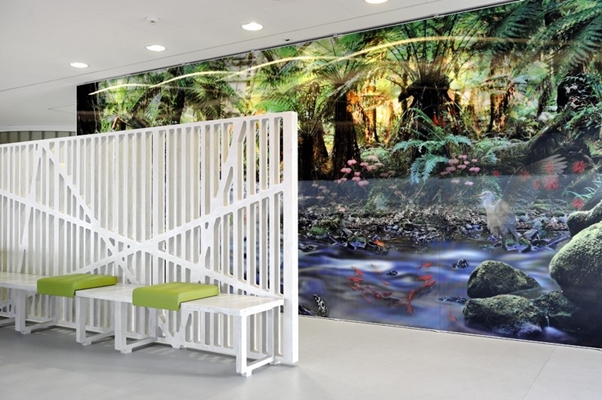 OPERA took the metaphor of the high street as the guiding principle for a coherent design. In addition, they created the option of variation by introducing a clever and sophisticated colour scheme that is slightly different in each area. Artists from around the world were asked to create illustrations to fit in with the interior design for the Parade. The signposting came out of the same uncomplicated ‘toolkit’. At the heart of the design lies its subtle balance between areas with little sensory stimulation, one where the child can withdraw to and enjoy privacy, to areas (a lounge area, a cinema etc.) where there is plenty of stimulus that will connect the child’s stay at the hospital with the outside world.