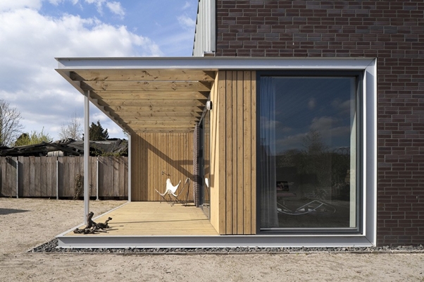 De kaderloze schuiframen zijn houten Slimline kozijnen. Voor de bekleding van de berging is een verduurzaamd open vurenhouten gevelbekleding gebruikt, die onlangs door Leeghwater Houtbereiding op de markt is gebracht. Zij hebben ook het hout voor het deck en de veranda geleverd, alles is op dezelfde manier behandeld. Binnen is het concept van de zonering in de vloerbedekkingen zichtbaar gemaakt. Verder valt binnen natuurlijk het gebruik van underlayment en vurenhout op waar het de niet permanente elementen betreft. De details van de binnenkozijnen zijn uit eenvoudige latten samengesteld en zodanig gemaakt dat de posities van de deuren makkelijk kunnen worden veranderd. De trappen zijn ruimtelijk belangrijke elementen, hier is veel ontwerpaandacht aan besteed. Deze zijn ter plaatse uit standaard materiaal gemaakt zonder dat dit standaarddetails heeft opgeleverd.