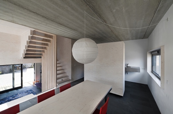 Materiaal / Details De details zijn zo ingetogen mogelijk gehouden. De gehele maatvoering is in de hoogte afgestemd op de maximale optrede uit het bouwbesluit: 185mm. Dat is ook precies drie lagen metselwerk; acht optreden is 1480mm en dat is een halve verdieping. De houten binnenbekleding is afgestemd op een standaardplaat van 1220 *2440mm. Met een passtrook van 260mm kom je dan eveneens op 1480mm uit. Er is zoveel mogelijk gebruik gemaakt van catalogusproducten: kalkzandsteen en baksteen voor de gevels, kanaalplaten voor de vloeren, geïsoleerde dakelementen als kap. Waar mogelijk is alles zo toegepast dat het materiaal herkenbaar blijft. Als dakbedekking is het relatief nieuwe Falzinc gebruikt. Een door Corus ontwikkelde aluminiumplaat met een zinkpatina dat te verwerken is als zink zonder de nadelen die dat materiaal voor het milieu heeft: namelijk uitlogen. Als goten zijn liggende staalprofielen (IPE180) gebruikt. De veranda is gemaakt uit hetzelfde materiaal als de goten.