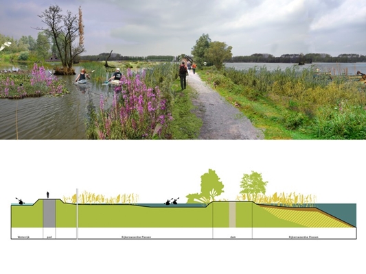 Voor het tussen Elst en Arnhem gelegen deelgebied Het Waterrijk is een uitwerking gemaakt. Met het landschapsontwerp verbonden thema’s zoals de natuurtypen, de waterhuishouding en de toegankelijkheid zijn uitgediept en ingevuld. Met een aantal gerichte ingrepen worden de Rijkerswoerdse Plassen, een tweetal forse zandwinplassen ten zuiden van Arnhem, in Het Waterrijk opgenomen.