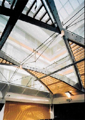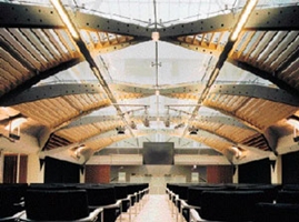 De zaal voor tweehonderd personen is geprojecteerd in een atrium, waaromheen kantoren gelegen zijn die uitzicht moesten behouden. Als invulling is gekozen voor een constructie die enigszins organisch aandoet tegenover het orthogonale van de bestaande bouw. Gevouwen stalen spanten dragen het grijze glas die de atriumruimte in tweeën deelt. Erboven ontstaat een nieuw kleiner atrium met een gebolde vloer van bijna zwart glas, waardoor geen zicht mogelijk is, maar door de gebolde vorm zijn de kantoren op de verdieping zeer goed bruikbaar. Eronder is een zaal ontstaan met een glazen plafond dat genoeg privacy geeft dat de gebruiker zich niet bekeken voelt, terwijl het constant veranderen van weersomstandigheden nog te beleven is. De spanten zijn tapstoelopend als de vingers van twee handen die met de vingertoppen elkaar juist raken.