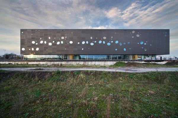 Bij benadering oogt het gebouw als een zwevende vierkante monoliet. Deze abstractie wordt bekrachtigt door de schijnbaar willekeurig over de gevel verspreide ovale ramen. Wanneer men dichterbij komt worden meer details in de gevelpatronen zichtbaar tot de door daklichten verlichte binnenwereld zich ontvouwt achter de glazen plint. De gevelplaten hebben een speciaal ontworpen patroon, gebaseerd op het logo van de gemeente Tilburg; de letter T. De sporthal is ingepakt in het overige programma. Bij binnenkomst passeert men de klimhal en enkele cafés alvorens de gorge te betreden.