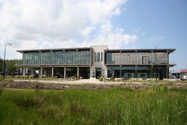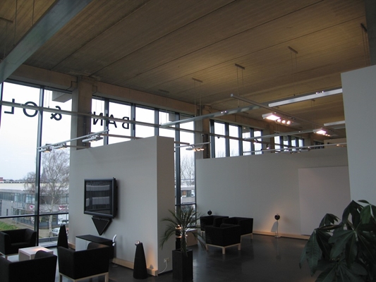 Ter plaaste van de showroomfuncties is de gevel vrijwel volledig transparant waardoor een zeer open structuur ontstaat.