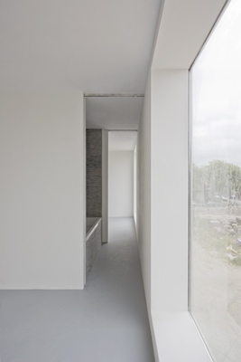 De functies van het woonhuis zijn op de klassieke manier van een herenhuis gestapeld. Werken is gesitueerd in het souterrein, wonen vindt plaats op de bel-etage en de slaapvertrekken zijn op de bovenverdieping. De trap is één lange cascade in de tussenruimte tussen het baksteenvolume en de aansluitende bebouwing. De entreedeur ligt in de glazen pui van deze 9 meter hoge, 9 meter lange en één meter brede ruimte die door zijn glazen buitengevels tussen publieke en private domein schijnt te liggen.