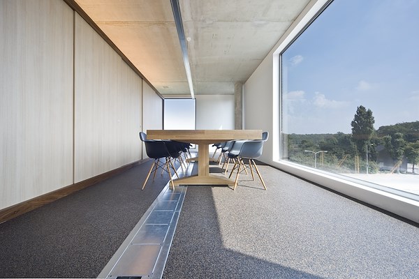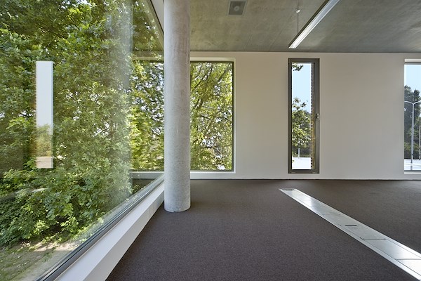 Het open, sobere karakter van het parkje vloeit naadloos over in de sobere esthetiek van het interieur van het gebouw. Grote, transparante elementen, natuurlijke materialen, glas, het gebruik van veel glad – bijna zacht ogend – beton en een aantal in het oog vallende details zijn een sobere spiegeling van de lucht en de bomen die door de ramen heen komen zetten. Net zoals in de natuur, waar dingen zich onderscheiden van elkaar door hun unieke eigenschappen, onderstreept de afwezigheid van deur- en raamkozijnen, plinten en verdere afwerkingen de unieke ‘look en feel’ van elk van de zorgvuldig gekozen, duurzame materialen.