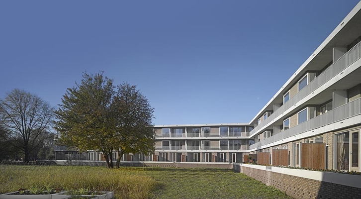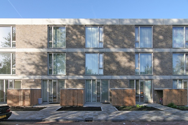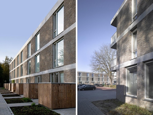 Het nieuwe ensemble bestaat uit twee appartementengebouwen en twee stroken met grondgebonden eengezinswoningen. Het hele complex is uitgevoerd in drie bouwlagen die ieder worden benadrukt door dikke betonstroken in het metselwerk en de strakke horizontale belijning van de balustrades.