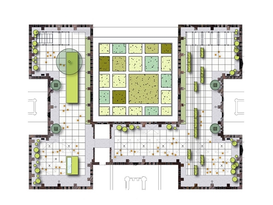 De patio als spoorweghart Vlak bij station Utrecht Centraal staat ‘De Inktpot’, Nederlands grootste bakstenen gebouw. Het gebouw ‘De inktpot’ heeft haar naam niet alleen als volksnaam of bijnaam, maar ook als koosnaam. Het gebouw heeft grote maat, maar met een verfijning in de detaillering en de afwerking. Voor de inrichting van de patio is OKRA gevraagd een buitenruimte te ontwerpen, waarbij eigentijdse veranderingen harmoniëren met de statische monumentaliteit van het gebouw. In niets weerspiegelt de huidige utilitaire ingerichte patio de inrichting op de functie die het gebouw heeft als logistiek centrum van de spoorwegen en de betekenis van de spoorwegorganisatie. In het uitgevoerde plan worden de schijnbare tegenstellingen en beperkingen zijn gebruikt om een patio te maken, die tot de verbeelding spreekt. Het ontwerp stelt een toneelset voor met divers gebruik van zowel het podium en haar decors als de wereld achter de schermen. Het huidige ‘utilitaire gebruik’ wordt aangevuld met een meer ‘gebruik tot genoegen’, dat evenzeer functioneel is, maar van een andere orde: het zitten in het zomerzonnetje, het gezamenlijk naar buiten gaan en een pauzegesprek voeren en het genieten van groen. De derde functie is die van ‘kijkgroen’. Het dak van het gebouw op de binnenplaats kan een dergelijke functie vervullen voor de gebruikers in de kantoren op de hogere verdiepingen, grenzend aan de binnenruimte. Het wordt een groen dak, gebruik makend van zeer beperkte draagkracht van het gebouw.