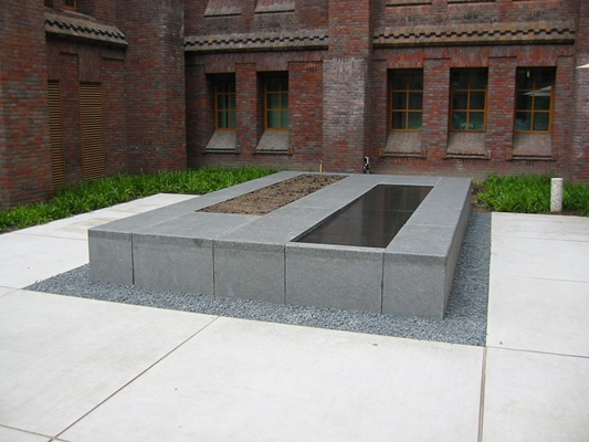 Dynamiek in inrichting Het zware utilitaire programma en het gebruik tot genoegen van de patio worden met elkaar verenigd door een modulaire vloer van stelcon platen als basis te nemen en daarop in te grijpen. De dynamiek zit vooral in de inrichting. Verrijdbare plantenbakken op rails en losse terrasstoelen vormen het meubilair. Op het moment dat er ergens meer zitbehoefte is of een intiemere plek gemaakt moet worden, wordt het meubilair er naar toe geschoven. Op het moment dat de hoogwerker ruimte vraagt wordt een en ander eenvoudig verschoven. Daarnaast is er een flexibele inrichting in de vorm van extra objecten, zoals een terrasvloer met verplaatsbare stoelen en met parasols. Divers gebruik komt samen in een ruimte met beperkte omvang en een beperkte hoeveelheid licht. De vormgeving van de ruimte is gericht op ‘vangen van licht’, zodat niet een somberte heerst en dat een sterk beeld ontstaat. De vloer wordt licht en er is gekozen voor materialen die iets van licht reflecteren. De textuur van de beplanting en een zekere ijlheid van de beplanting zijn voor de beleving bepalend. Frêle bladeren en een lichte stam tegenover een donkere achtergrond geven diepte.