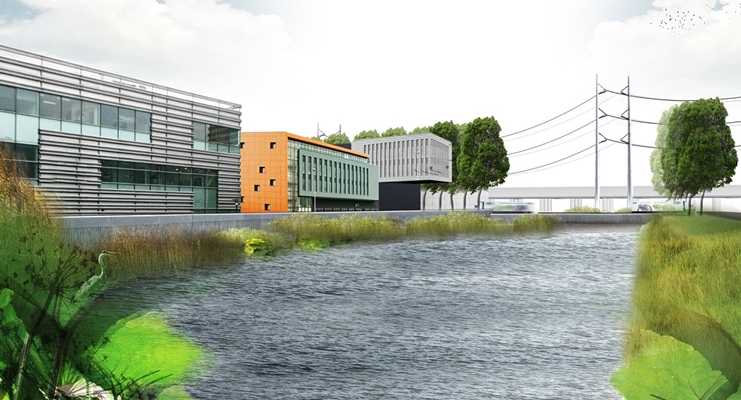 Greentech Business Park Bleizo is a business park in a metropolitan hub. Here, the established companies are affiliated with the agri-food sector and are pioneers in the development of clean technology. Besides a working environment, the business park offers an attractive public realm with space for nature, leisure and recreational use in the theme of ‘food, energy and nature’. As a result of this urbanization the scale of the space is changing. Bleizo’s near surroundings are currently characterized by large scale objects such as the Siemens plant, the HSL High Speed Rail, TenneT, the windmills of Zoetermeer and the flower auction of Bleiswijk. For Bleizo the challenge is to present this surreal scale not as a threat, but to use it as a quality. This can be done by creating deliberate contrasts between the large scale and small scale, between hard and soft, busy and calm, exposed and intimate. The spatial design for Bleizo is based on ‘Stage and Landscape’. Five zones connect the city with the landscape of the Rottezoom. In addition to these green veins there are places that contribute to the orientation. Quality is created by making a good route network with sufficient inviting places. Special attention is given to the design of the night image. Highlighting the various large scale elements makes Bleizo an iconographic image and a recognizable landmark along the A12 Highway and HSL.