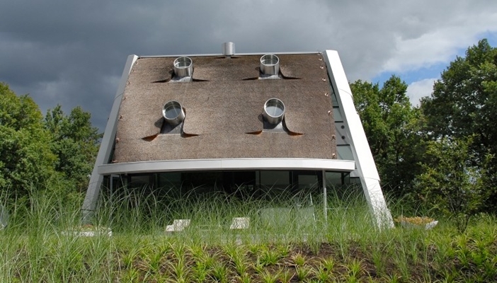 Op een open plek in de bossen bij Beekbergen is een unieke villa gebouwd. Vanaf de openbare weg niet zichtbaar duikt een kegelvormige betonnen sculptuur met een gebogen rieten dak op tussen de bomen.