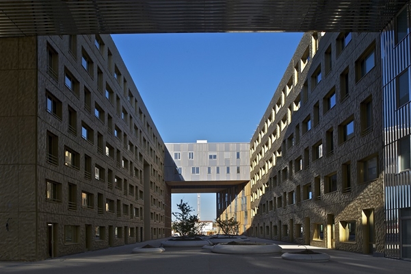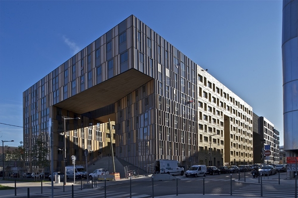 The Monolith is a mixed use building by Erick van Egeraat for ING Real Estate Development France in collaboration with French architects Combarel-Marrec, Manuelle Gautrand, Pierre Gautier and the Dutch Architect Winy Maas. This superblock is part of urban renewal project Lyon Confluence. This inner urban renewal project transforms a derelict former industrial area into a contemporary element of Lyon’s city center. For this project of 32.000 m2 each of the five participating architect designed a specific section of the building. Erick van Egeraat designed the Northeastern entrance section of 7.000m2. The section consist of offices and apartments with an elevated entrance and underground carpark. Special attention was given in accentuating the façade which is primarily constructed in glass and wood. An irregular pattern accentuated by vertical wooden fins introduces a surprising element which counteracts with largely horizontal orientation of the other sections. Special attention has been giving to the sustainable nature, construction and use of this building. This superblock is one of the key-elements of the Lyon Confluence development. Due to its sheer scale it forms a strong and vital urban element.
