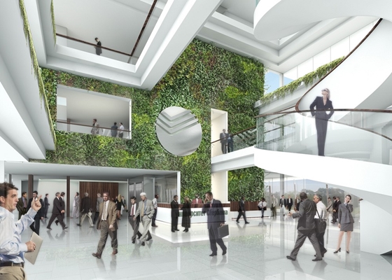Defining technical demand are a high level of sustainability and a very short building process. The campus lay-out allows for many building elements to be constructed simultaneously. The load bearing structure consists of prefabricated concrete columns and floor slabs. All facade and space dividing elements are executed with prefabricated wood and glass elements. The complex fully integrates sustainable design tools and technologies, putting sustainability in the centre of the corporate agenda.